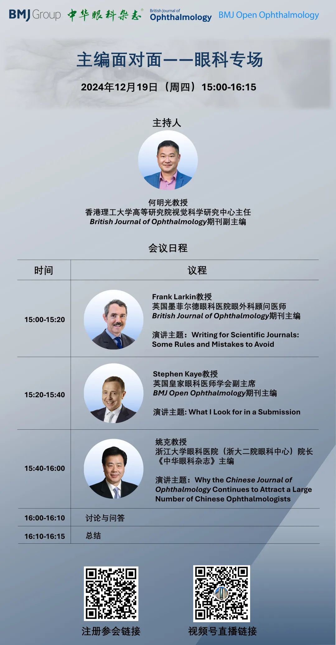 为了赋能眼科领域的临床专家、科研人员及业界同仁,助力他们撰写并成功发表高质量的学术论文,同时深化对国际期刊选稿准则及发表范畴的了解,BMJ集团旗下两本权威眼科期刊——British Journal of Ophthalmology(BJO)与BMJ Open Ophthalmology携手《中华眼科杂志》,共同精心筹备了一场在线研讨会:“主编面对面——眼科专场”。