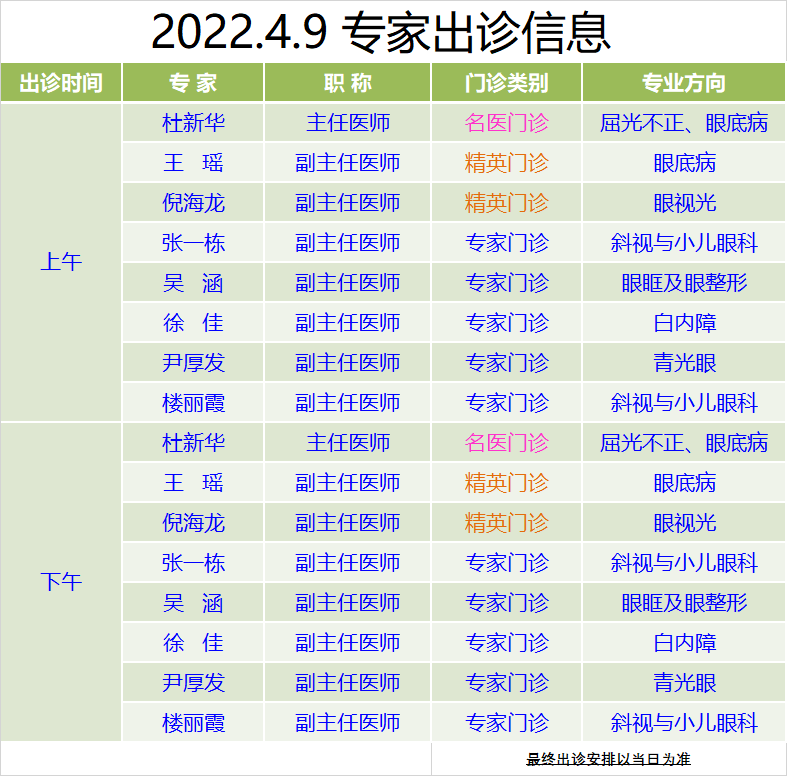 3. 周一至周五专家出诊信息,敬请关注新浪微博@浙二眼科中心、微信公众号【浙二眼科中心】。