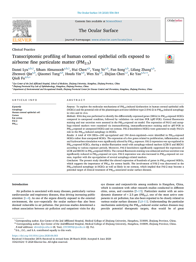 相关研究论文“Transcriptomic Profiling of Human Corneal Epithelial Cells Exposed to Airborne Fine Particulate Matter (PM 2.5)”发表在眼科学著名期刊《眼表》上(The Ocular Surface,影响因子12.336)。