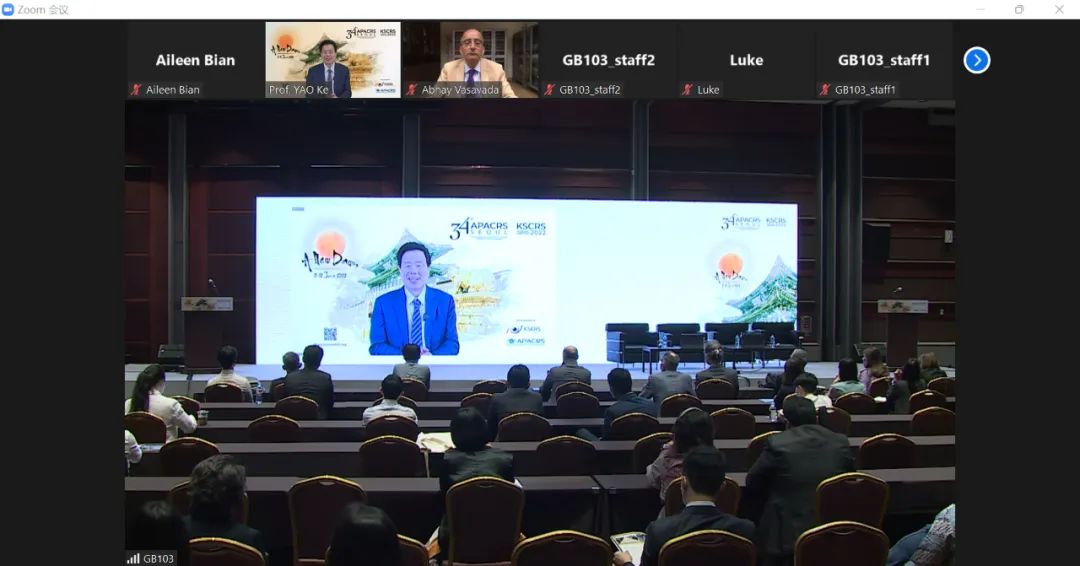 由于疫情原因,姚教授无法亲临现场,他通过视频连线向大会的成功召开表示热烈祝贺,并衷心感谢亚太白内障及屈光手术学会的高度认可与肯定,感谢学会对于中国白内障及屈光手术近年来所取得成绩的赞赏与鼓励。姚教授表示,很荣幸也很自豪能在过去几十年的职业生涯中与亚太白内障及屈光手术学会保持紧密联系与合作,也将在今后为继续推动中国乃至亚太地区的白内障及屈光手术发展作出自己的贡献。