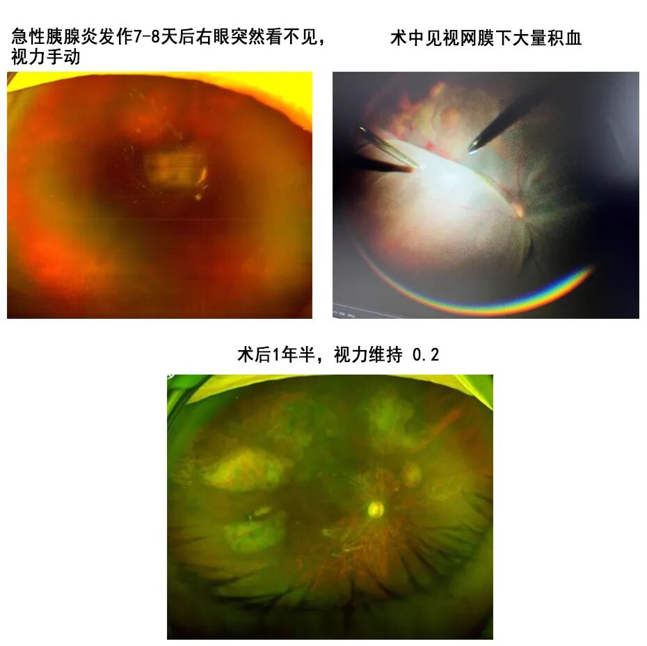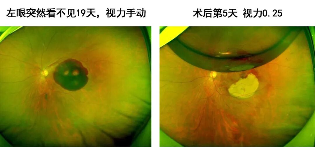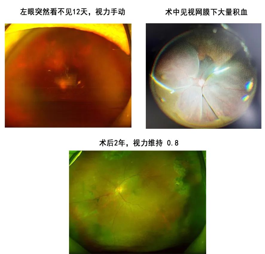 而对于急性累及黄斑部的超大范围视网膜下出血,通过玻璃体手术或rtPA辅助,术中即行视网膜下积血清除,方肖云主任表示,本中心眼底病团队已积累了丰富的手术经验,手术后视力均有不同程度的提高。