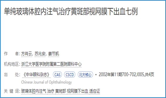 浙江大学眼科医院(浙大二院眼科中心)眼底病专科团队一直在探寻治疗黄斑部视网膜下出血的方法。早在2002年,团队在国内率先报道采用单纯玻璃体腔注气术结合低头位成功治疗黄斑部视网膜下出血,方法简单,效果较好,患者术后数天视力即可提高,相关论文发表在中华眼科杂志。