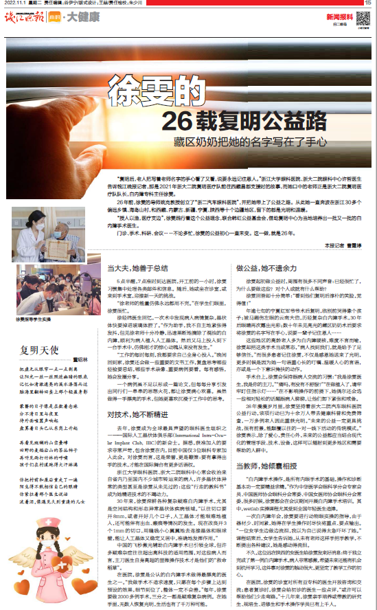 26 年漫漫岁月里,徐雯坚持着浙大二院汽车眼科医院公益行动,该项行动已为十余万人带去健康科普和免费筛查,一万多例老人因此重获光明。“未来的公益一定更具挑战,很有前景,能颠覆以往的一对一线下活动的传统模式。”