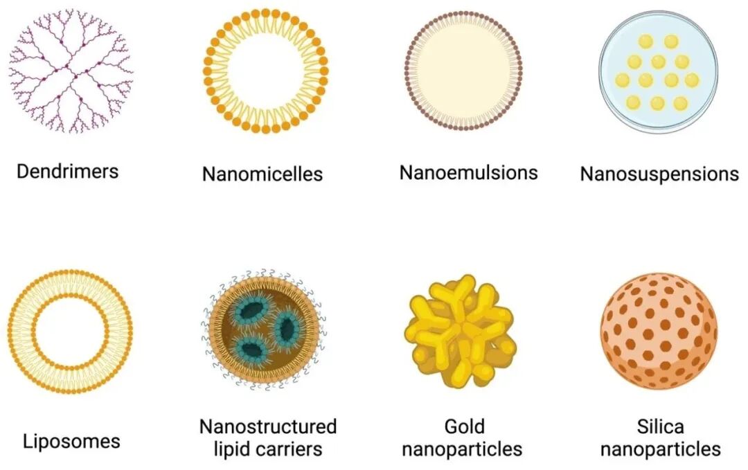 DED是一种多因素眼表疾病,以泪膜稳态丧失为特征,并伴有眼部症状,其中泪膜不稳定和高渗透压、眼表炎症和损伤以及神经感觉异常起着重要作用。干眼会极大地影响视觉功能(如斜视、光晕、复视、闪光、畏光等),引起上睑下垂、丝状角膜炎和泪腺区域肿胀,导致眼部不适(如干燥、发红、异物感、烧灼感、伤害性疼痛、神经性疼痛、眼疲劳等),随着病情进展,严重者甚至可能导致视力丧失。眼科手术、不适宜的环境条件和使用角膜接触镜等危险因素的存在导致了DED患病率的增加。治疗方法包括睑板腺热敷、鼻泪神经刺激、局部药物等。在这些选择中,局部用药物是最常见的一种。然而,DED局部用药有以下几种局限:患者依从性、眼压升高和副作用等。此外,由于泪液稀释和泪管引流,药物的浓度极低,导致滴眼液的作用时间短。因此,局部给药治疗DED的频率较高。近年来,纳米药物在眼科、肿瘤学、自身免疫性疾病等领域发挥了重要作用,为疾病的诊断、预防和治疗提供了新的思路。