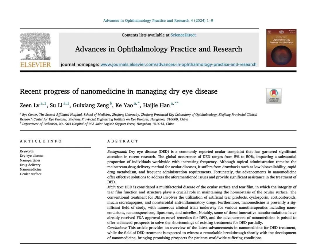 近日,浙江大学眼科医院(浙大二院眼科中心)姚克教授、韩海杰研究员团队在 “Advances in Ophthalmology Practice and Research”期刊发表了题为“Recent progress of nanomedicine in managing dry eyedisease” 的综述。浙江大学医学院附属二院眼科中心硕士研究生吕泽恩为论文第一作者,姚克教授和韩海杰研究员为论文的共同通讯作者。