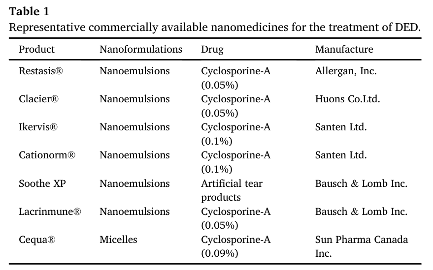 Table 1. 用于治疗干眼病的具有代表性的市售纳米药物